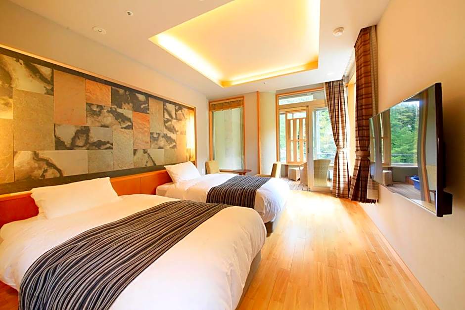 결제는 현금 미취급(무현금)이며 JCB, 아메리칸 익스프레스, 비자, 마스터카드, NICOS, UC, 유니온페이 등을 사용할 수 있습니다. 객실 유형은 슈페리어 모던 재패니즈 스타일, 서양식(트윈), 일·양식, 산 전망의 일본식 및 일본식(산 전망) 등 일본식과 양식 스타일을 아우릅니다. 모든 객실은 금연이 기본이며 무료 세면도구, 비데, 욕조가 구비되어 있습니다. 일부 객실(예: 강 전망 트윈룸, 온천 욕조가 있는 트윈룸 또는 온천 욕조가 있는 일본식 객실)에서는 강 또는 산 전망이나 온천 욕조를 이용할 수 있습니다.